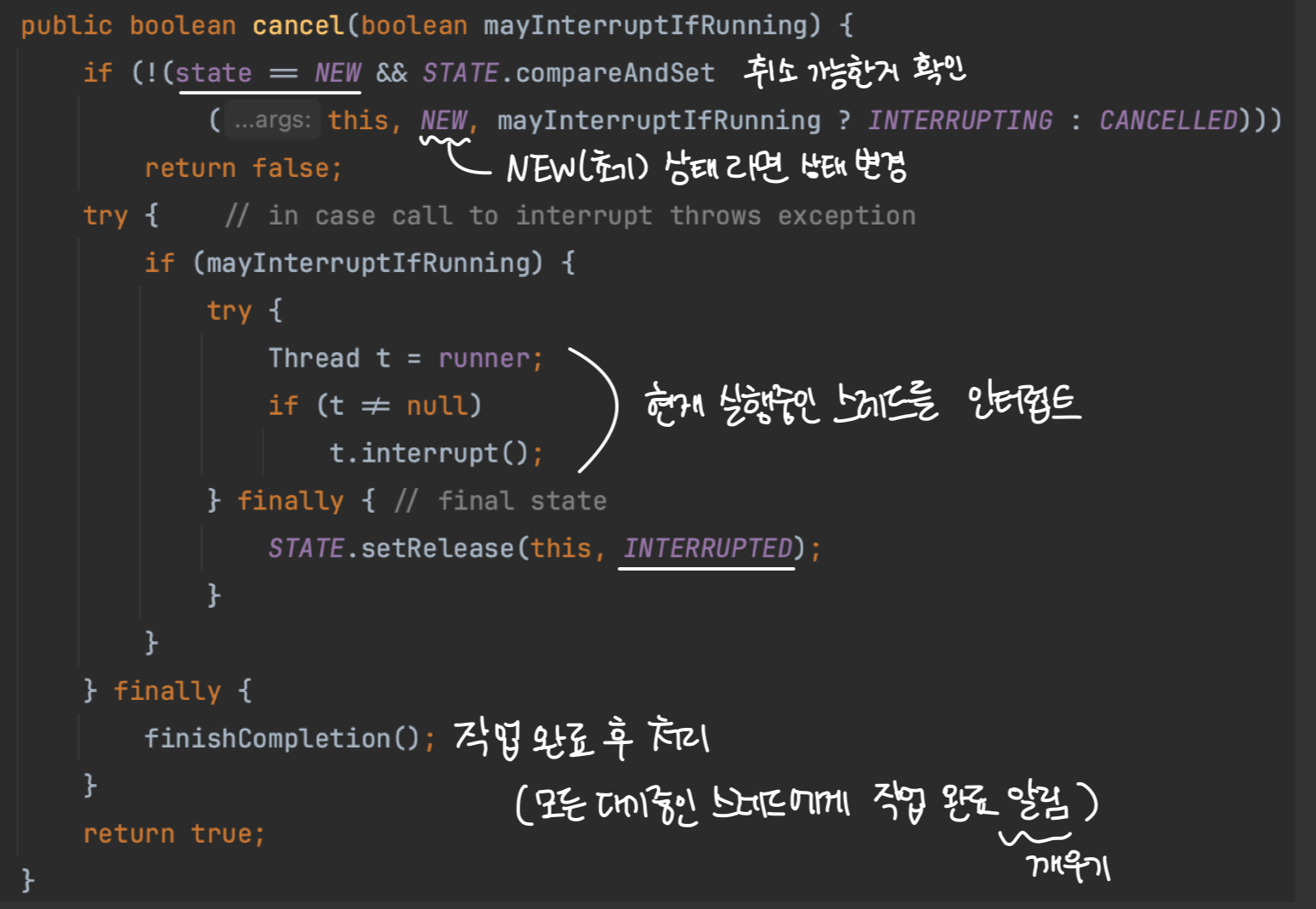 cancel()이 호출되면 작업과 연관된 모든 대기 중인 스레드를 깨우고 시그널을 보내며 done()을 호출하고 callable을 null로 설정합니다.