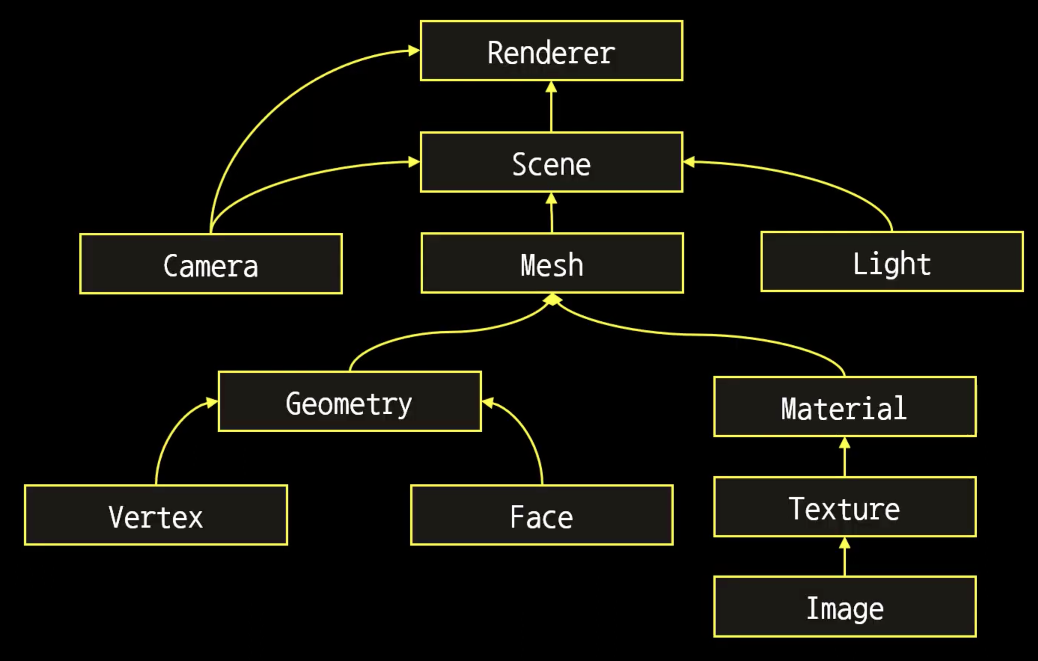 Mesh(형상)에는 형상을 구현하는 모양(Geometry)와 재질(Material)이 들어간다. Geometry는 Vertex(꼭짓점)와 Face(면)로 구성되고, Material에는 Texture가 들어가고 Texture는 Image를 가져다 쓴다.