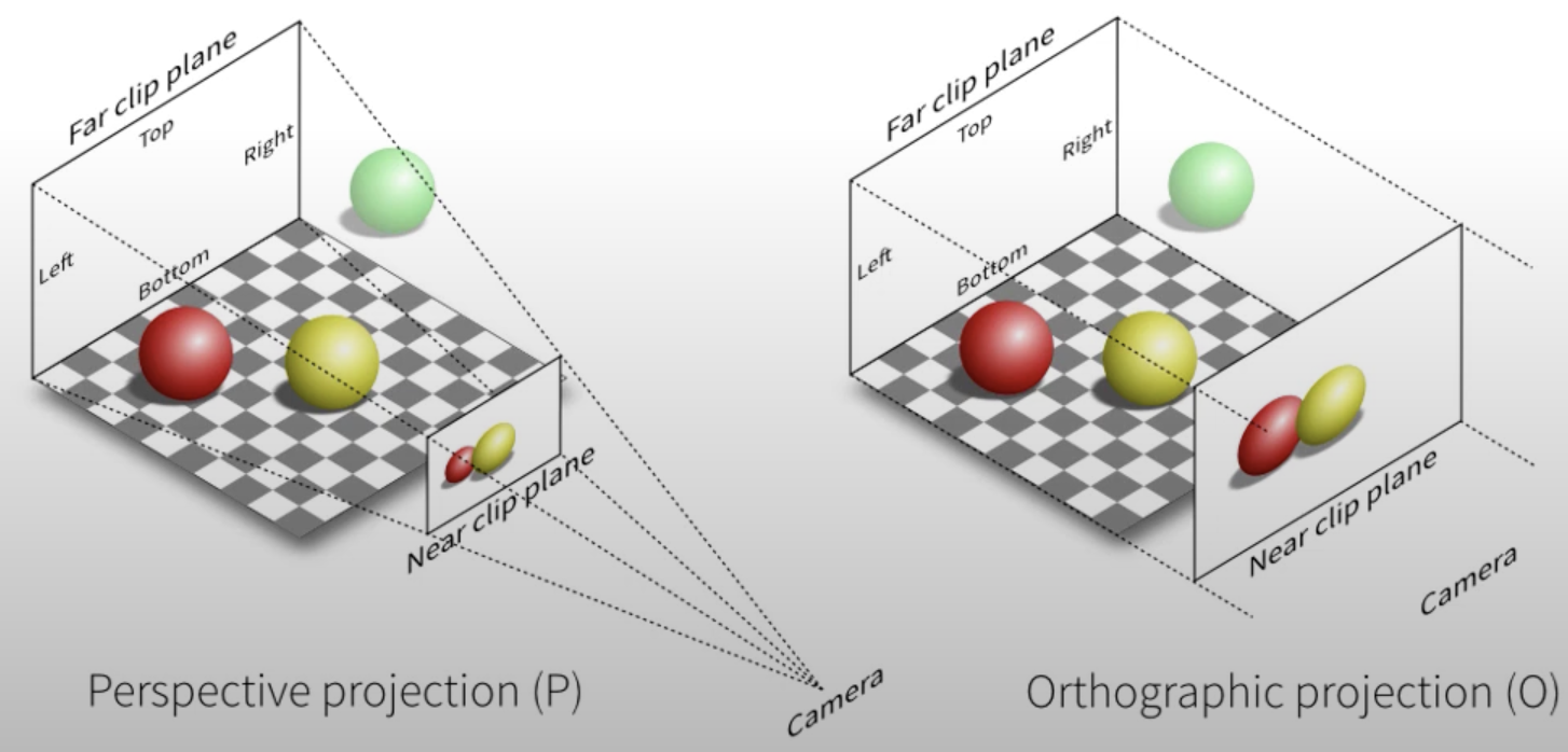 Orthographic camera는 원래 평행했던 두 개의 직선은 계속 평행이 유지된다는 특징이 있다. orthographic camera는 camera의 z-position을 조절한다고 해서 거리감이 달라지지 않는다. aspect ratio를 바꿔서 조절해야 한다.