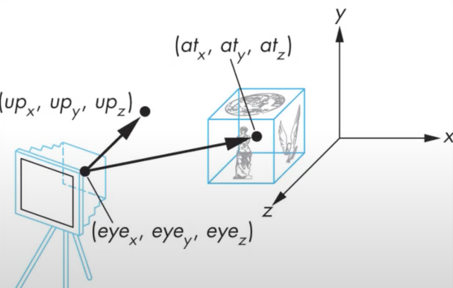 카메라의 위치(eye)와 카메라가 바라보는 위치(at)을 이용하면 카메라가 바라보는 방향이 정해지고, 위쪽을 나타내는 점이 있으면 up-vector가 정해진다. 이 3점을 통해 카메라의 위치와 방향을 특정할 수 있다.