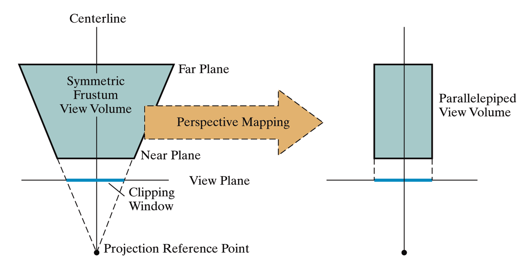 Perspective Projection의 경우 View Volume이 피라미드 위를 잘라서 만든 모양이 되는데 이를 Camera Frustum(각뿔대) 이라고 한다. 이 View Frustum을 Normalized view volume으로 변환하는 것, 즉 Camera Coordinate을 NDC로 변환하는 것이 바로 Projection Transformation이다. 이때 z의 방향이 달라지면서, 오른손 좌표계에서 왼손 좌표계로 바뀐다.