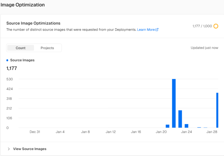 Image 컴포넌트의 경우 vercel에서 자동으로 최적화를 해주는데 무료버전에서는 최적화를 해주는 횟수에 제한이 있었던 것이다. 1달에 1000건인걸로 알고있다.(아닐수도 있음.)