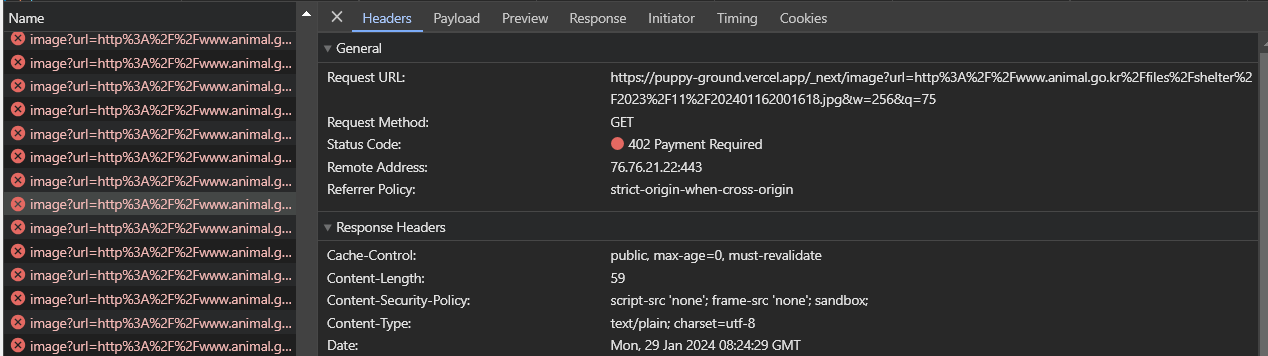 로컬에서는 아무 문제가 없기에 배포 후 문제인걸 알게되었고 배포된 url에서 network창을 켜보니 저렇게 402 payment Required