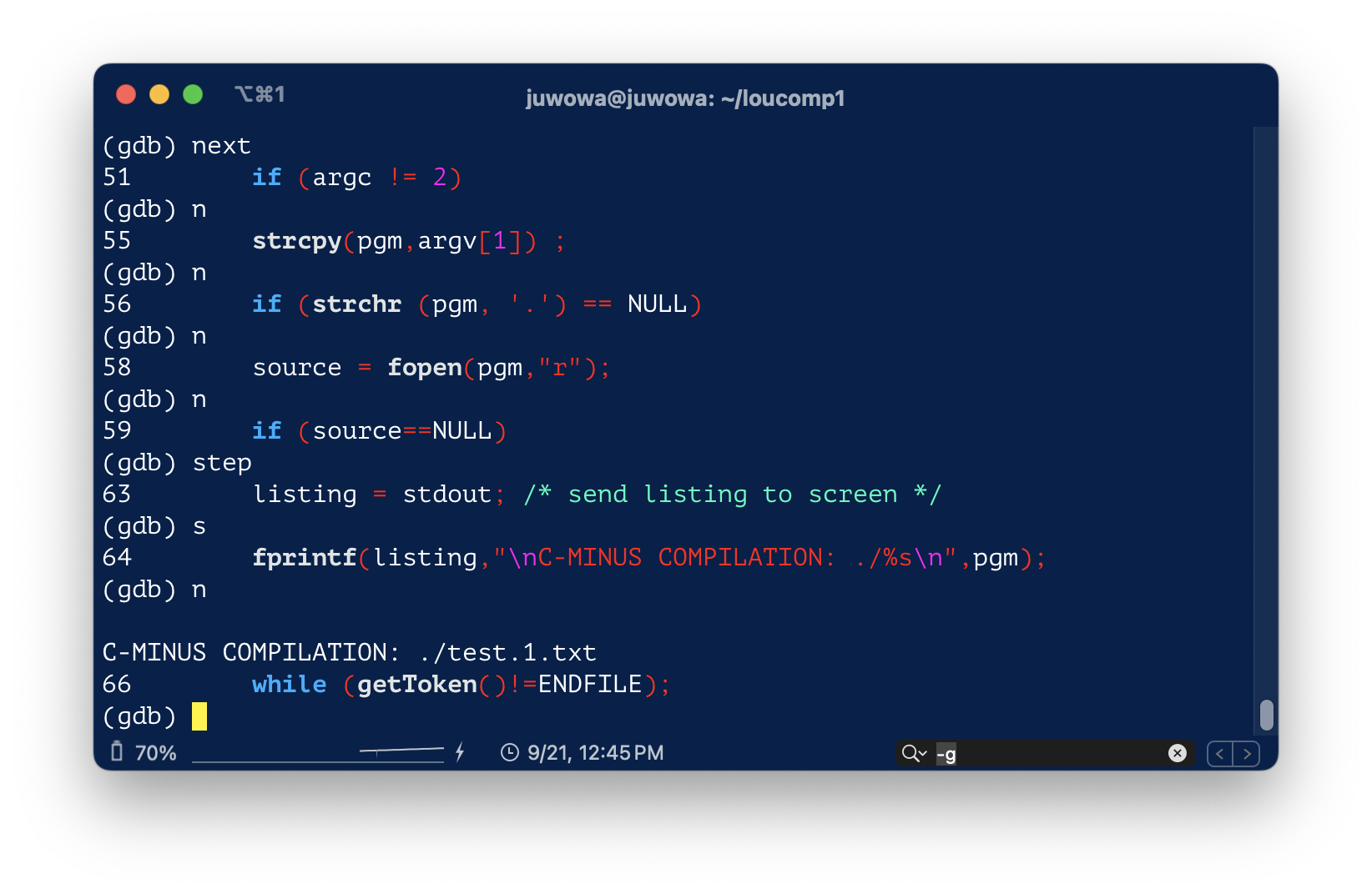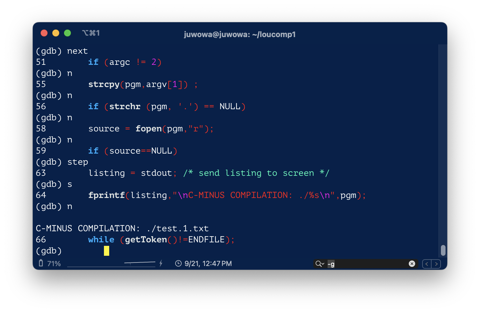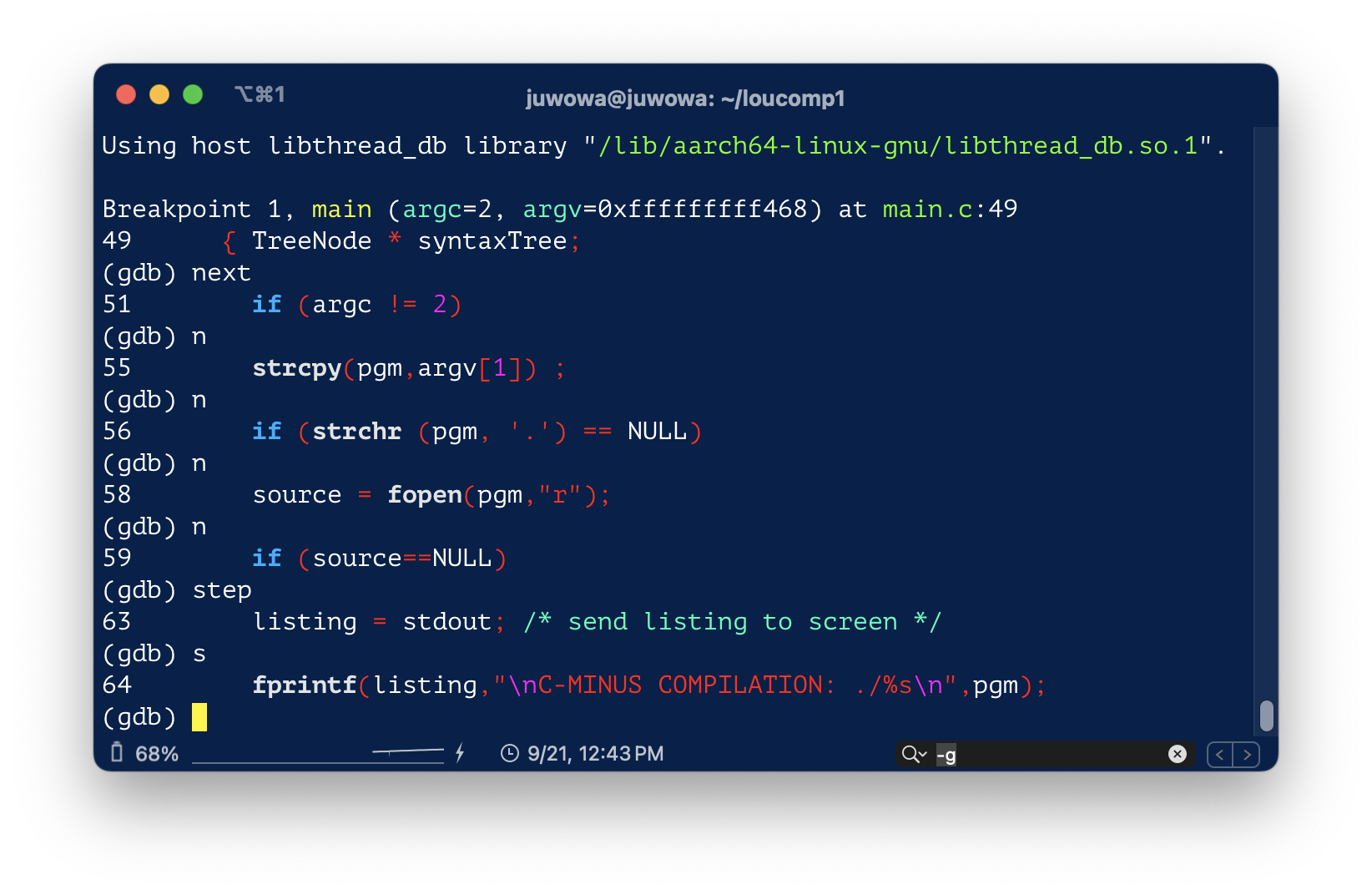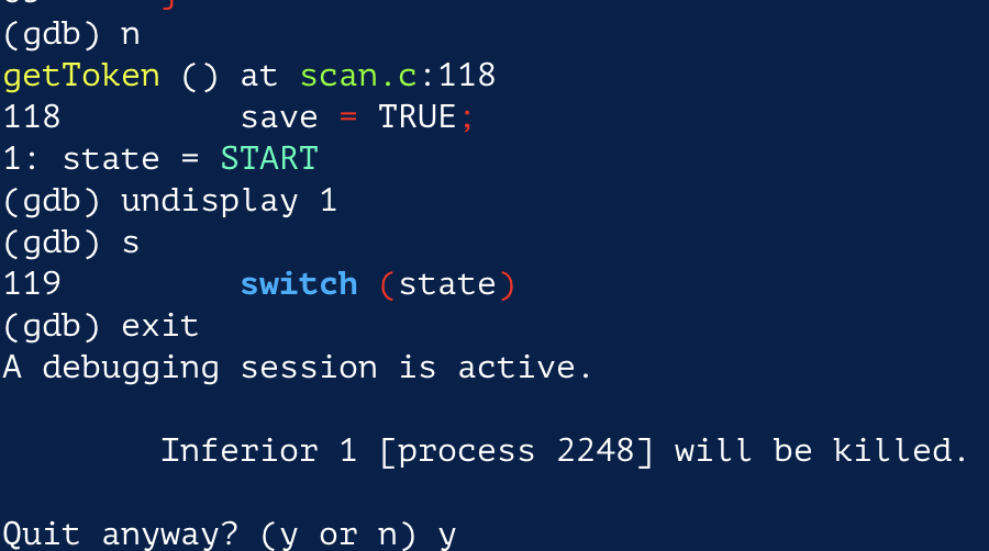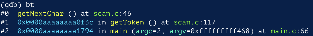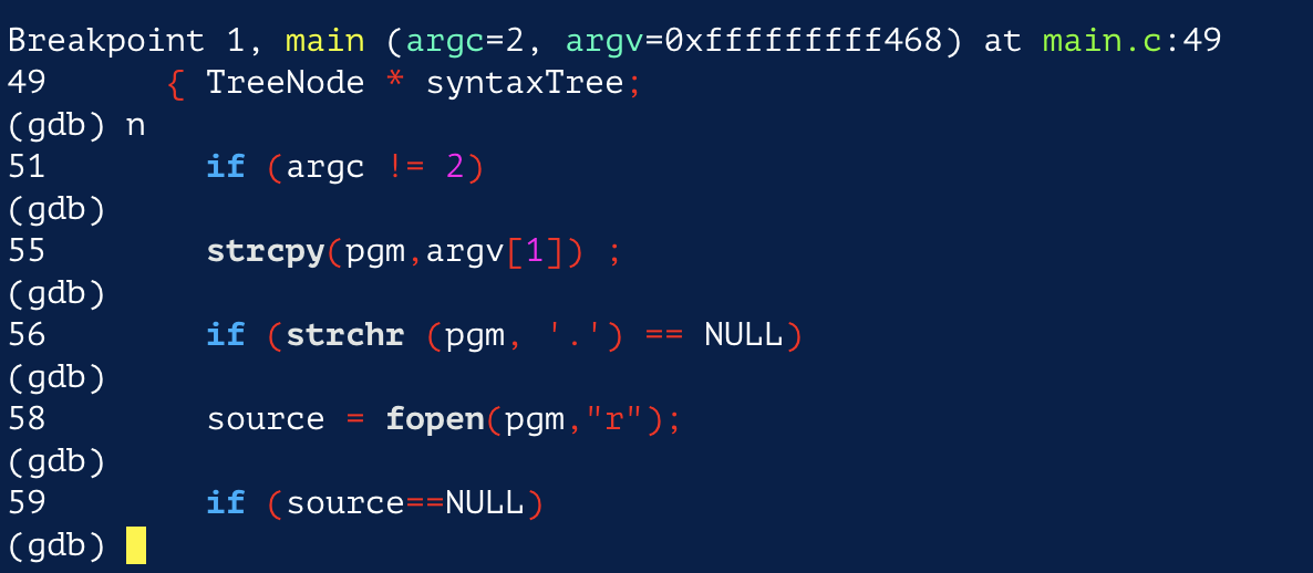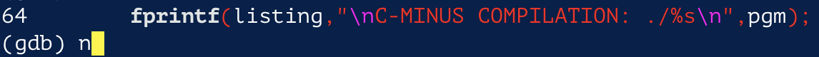 위의 스크린샷 에서 가장 마지막의 fprintf() 구문을 실행시키려면 next나 n을 입력하면 된다.