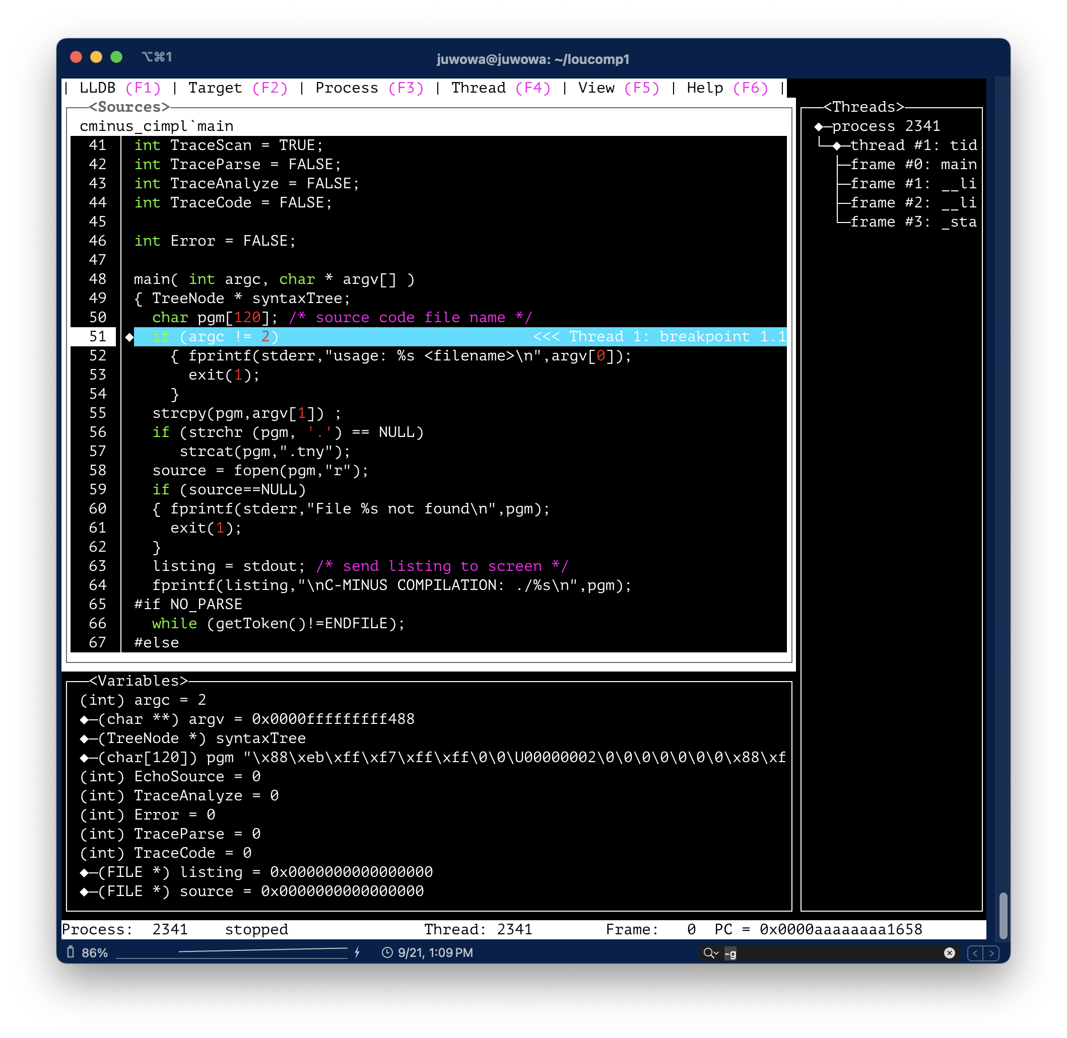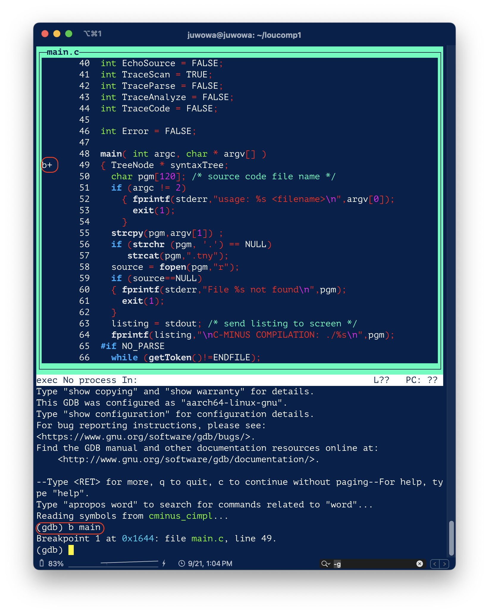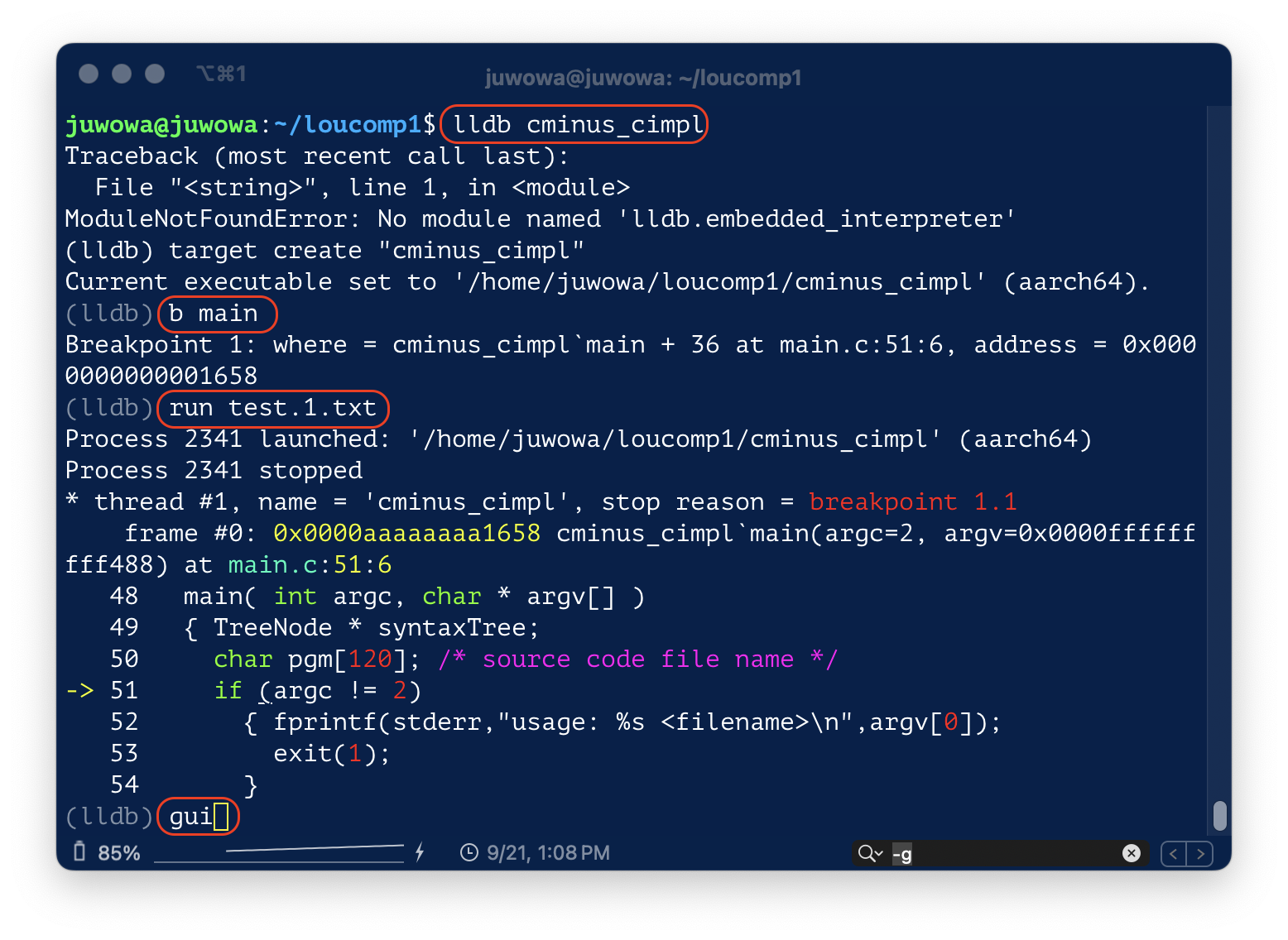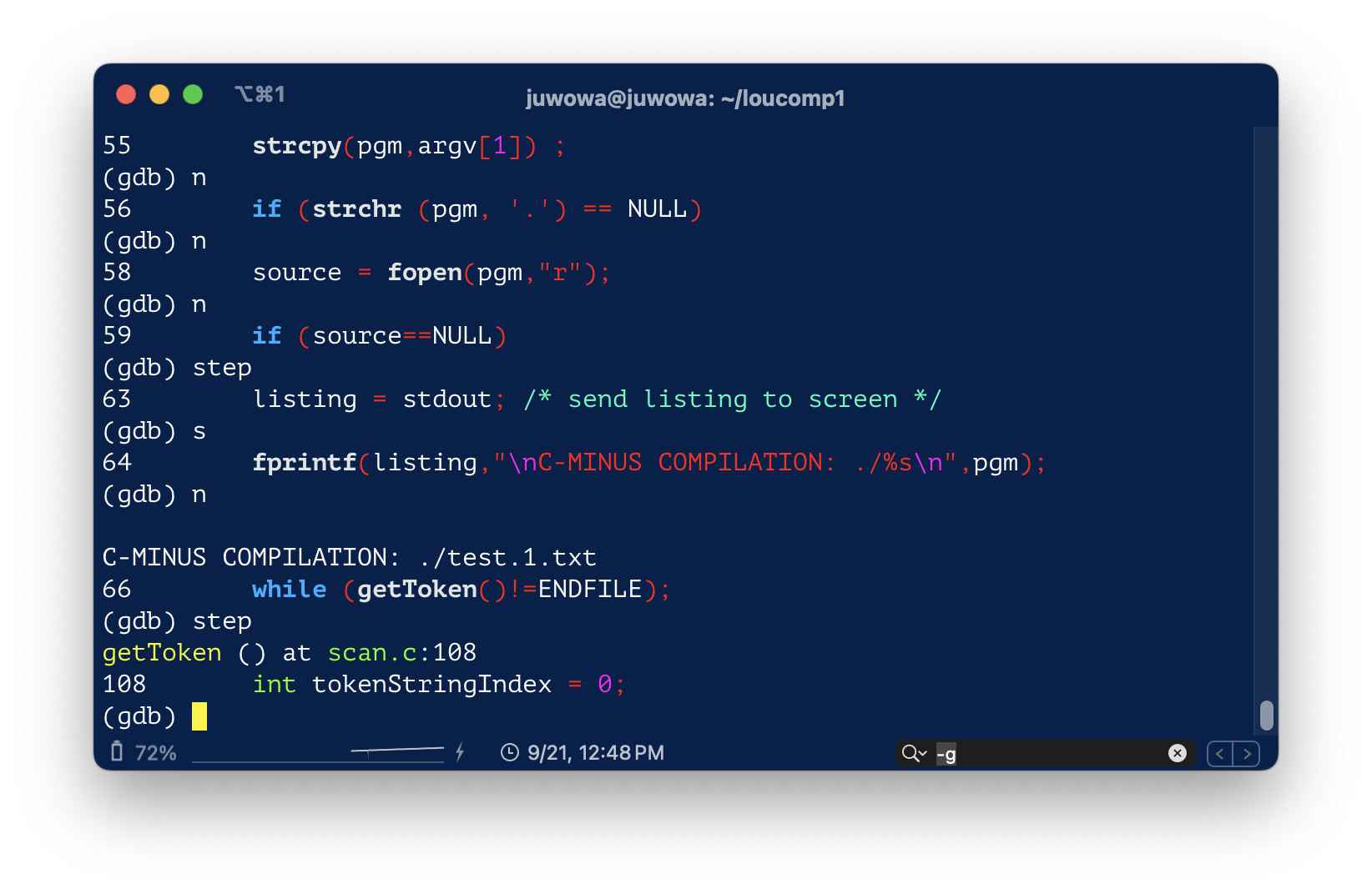 위의 스크린샷 에서 가장 마지막의 fprintf() 구문을 실행시키려면 next나 n을 입력하면 된다.