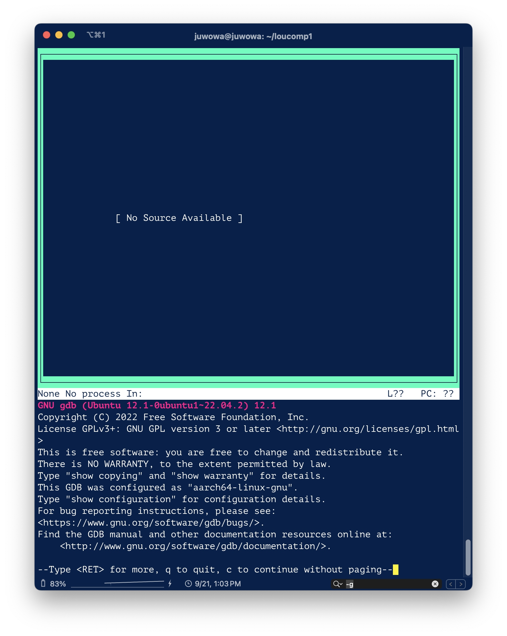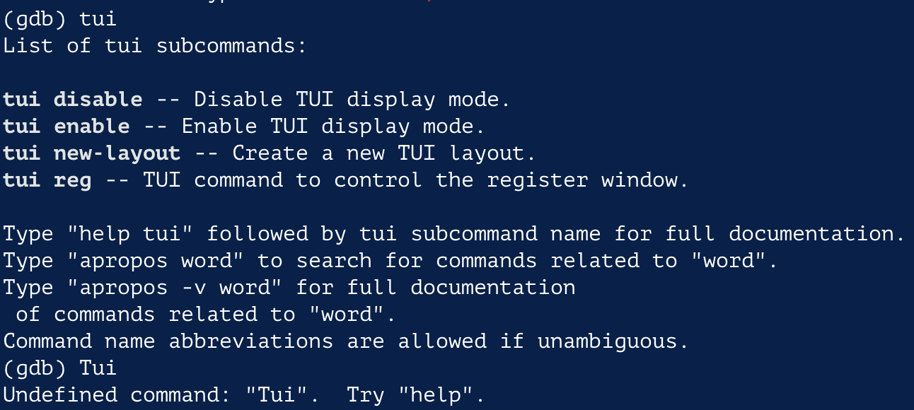 GDB 실행 시 한줄 씩 밖에 못보지만, 여러줄을 보고 싶다면 tui 모드를 사용하면 된다.