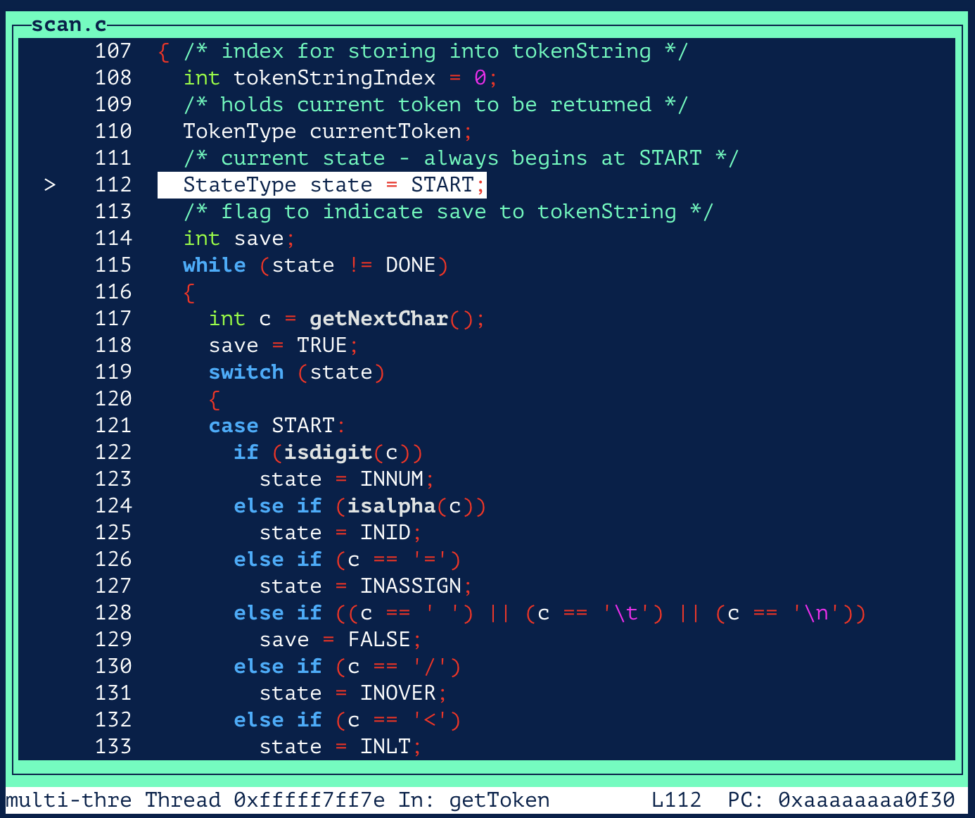 현재 가장 마지막 줄의 getToken 함수의 안으로 들어가 실행 경과를 살펴보려면 step, s 입력하면 된다.