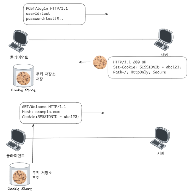 - 쿠키 + 세션 방식: 서버가 만든 "세션 식별자"만 쿠키에 저장해 두고, 클라이언트는 그 값만 보내면 된다.