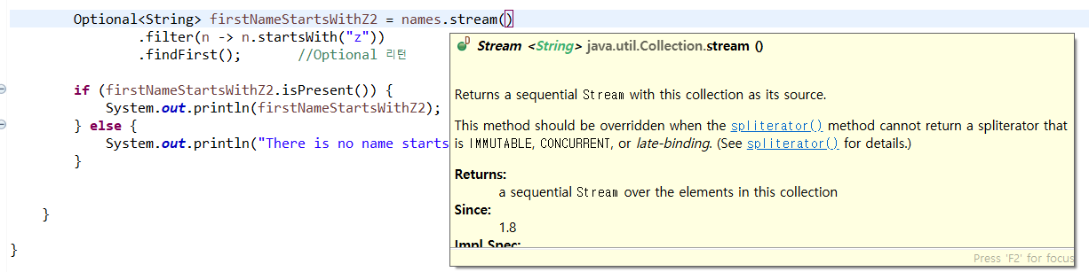 이클립스에 작성한 코드 상의 .stream() 에 커서를 올렸을 때, 아래에 나타난 내용을 바탕으로 보면 아래와 같다.