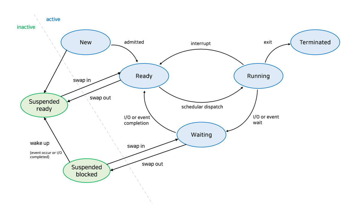 - Terminated: 수행이 끝나고 정리하는 상태