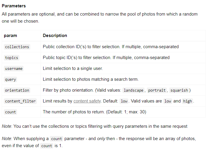 GET /photos/randomhttps://api.unsplash.com/photos/random?client_id=YOUR_ACCESS_KEY