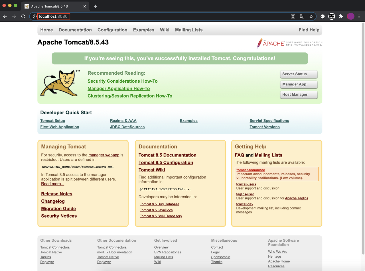 Tomcat started. 라는 메세지가 나오면 chrome 이나 safari 앱을 이용해서 localhost:8080 으로 접속해서 Apache Tomcat 페이지가 표시되면 성공!