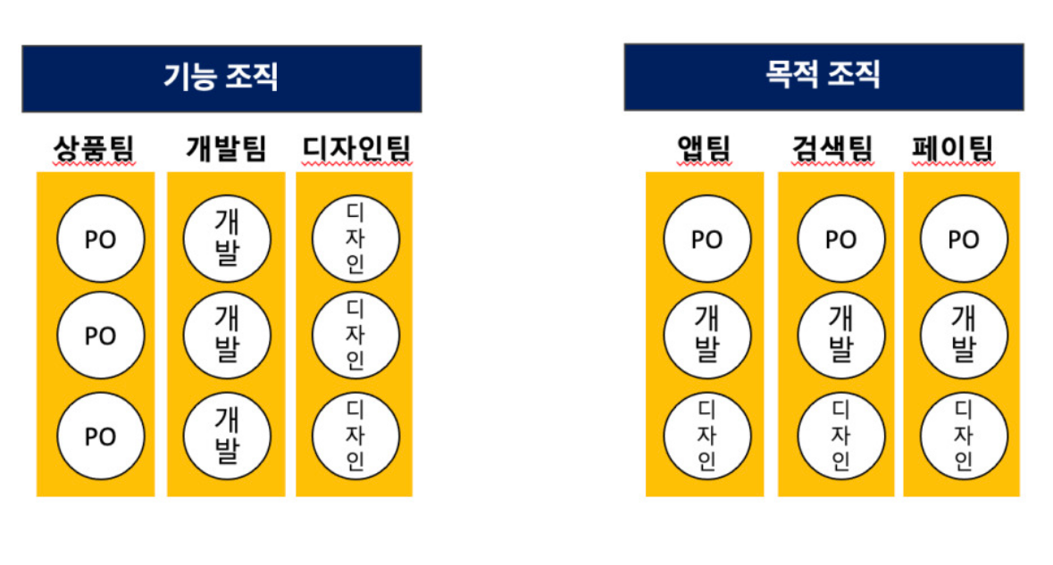 - 목적구조: 특정목적(프로덕트, 프로젝트, TF)를 달성하기 위해 관련된 포지션이 한 팀에 소속되어있는 것