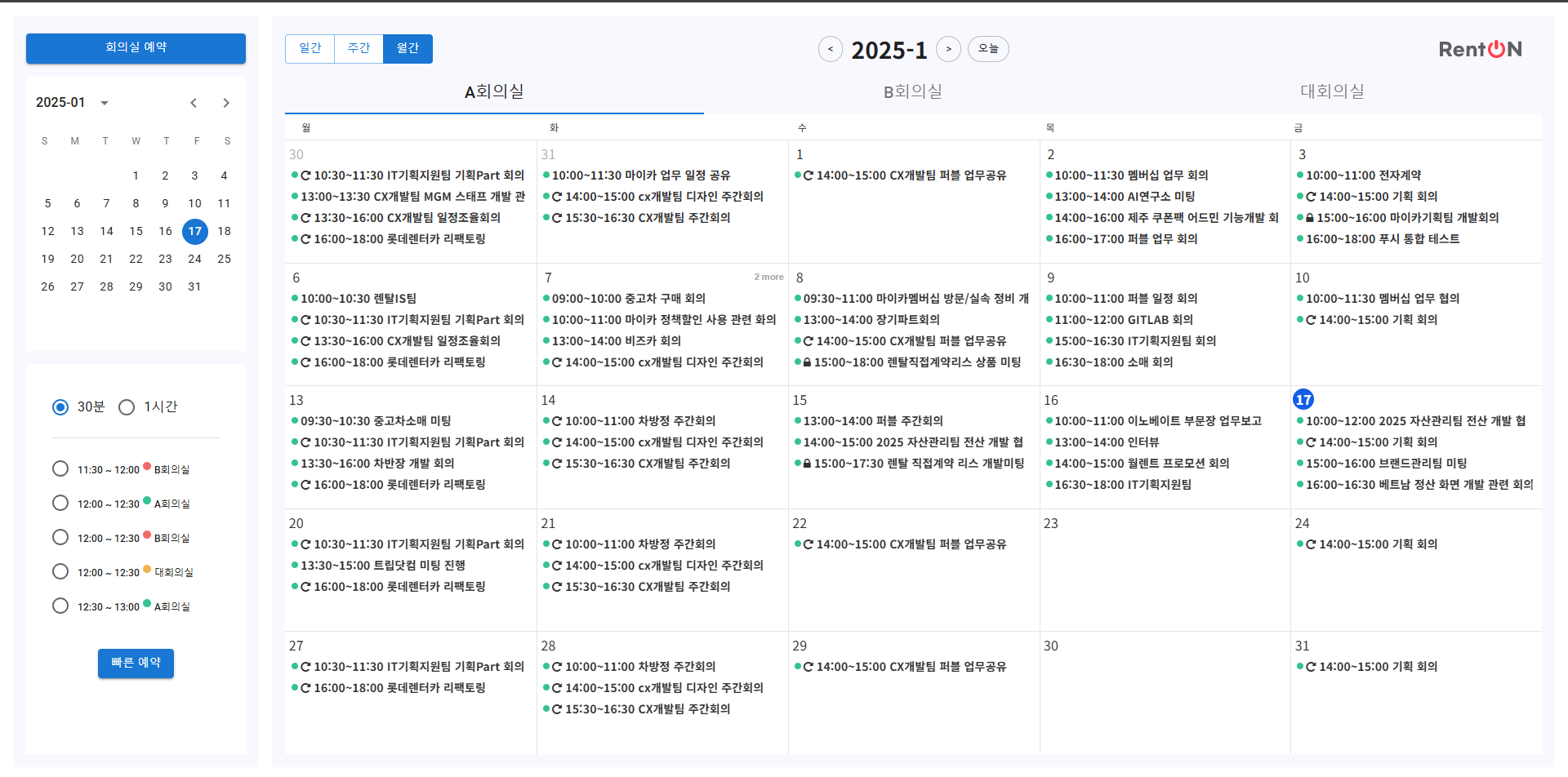 결국 TUI Calendar를 도입하기로 결정했다. 이 라이브러리는 타임라인 뷰는 없지만, 일간 뷰를 통해 각 회의실의 예약 현황을 표시할 수 있었고, 완전 무료라는 점이 큰 장점이었다. 또한 월간, 주간, 일간 뷰를 모두 제공해 충분히 요구 사항을 충족할 수 있었다.