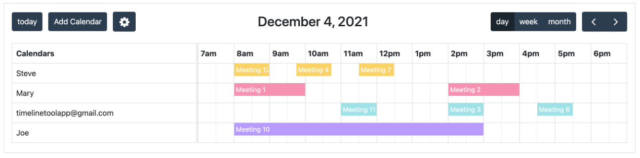 먼저 가장 중요한 기능인 한 눈에 여러 회의실의 가용상태를 확인하기 위해서는 아래와 같은 타임라인뷰 기능이 필요했다.