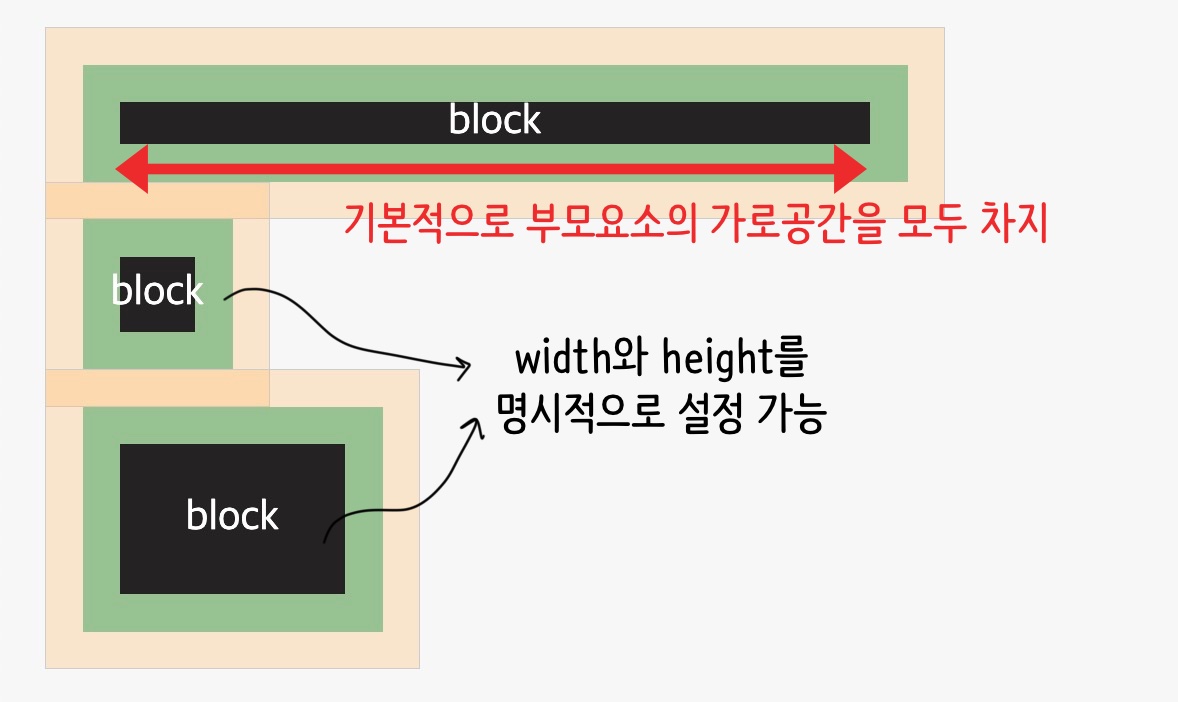 block속성의 width는 기본적으로 부모 요소의 너비의 거의 100%를 차지[1]하며, 부모 요소의 크기를 결정하는 데 영향을 미칩니다.