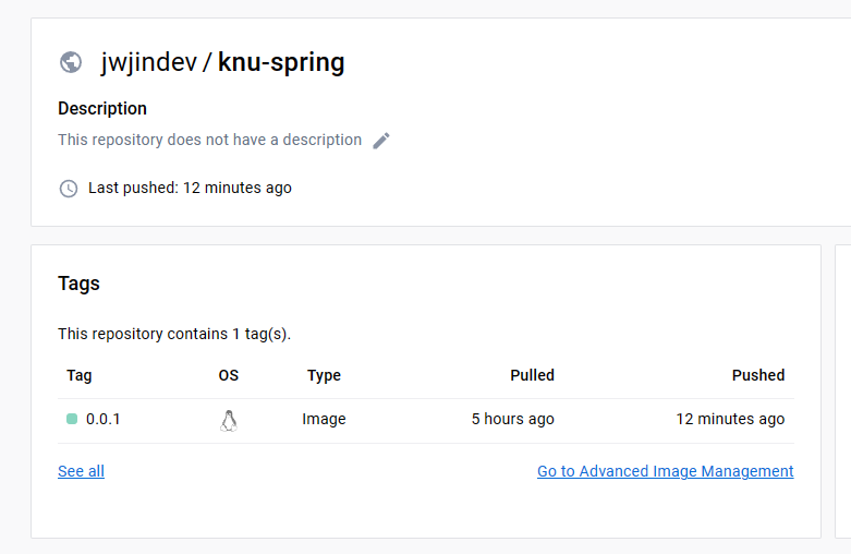 정상적으로 푸시 되었고, pull 명령어를 사용하여 이미지를 가져오면 된다.