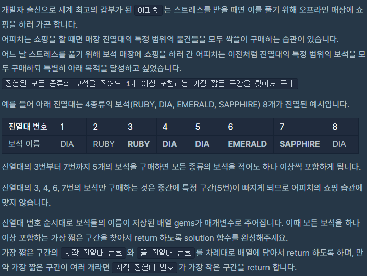 처음에는 시작점과 끝점을 배열의 처음부터 끝까지 지정한 후, 가장 짧은 구간이 나올때 까지 양 쪽을 줄이며 카운트하여 답을 찾으려고 했다. 하지만 효율성 테스트에서 실패 하였다. 그래서 직접 함수를 작성하여 모든 보석이 포함되었는지 확인 했었는데, 이 부분은 Counter 함수를 사용하였고, 탐색은 투 포인터 알고리즘을 활용하고, 또한 최대한 카운트를 줄이고자 했다.