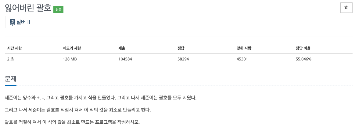 양수와 +,-를 이용한 수식에 괄호를 적절히 사용하여 최솟값이 출력되도록 하는 문제이다.