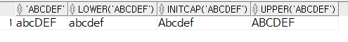 SELECT 'abcDEF', LOWER('abcDEF'), INITCAP('abcDEF'), UPPER('abcDEF')
