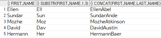 SELECT first_name, SUBSTR(first_name, 1, 3), CONCAT(first_name, last_name)