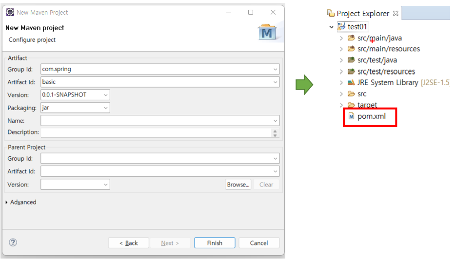 Maven Project -> create a simple project체크 -> next -> Group Id (도메인주소 거꾸로 작성한것) Artifact Id(나머지경로) -> finish