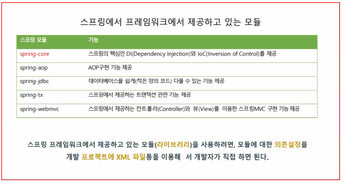 스프링 프레임워크의 소스는 모두 라이브러리로 분리시켜 놓음으로써 필요한 라이브러리만 가져다 쓸수 있습니다. 그리고 많은 외부 라이브러리들도 이미 스프링 프레임워크