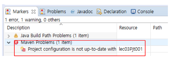 Maven Update를 설정 : 프로젝트 우클릭 -> Maven -> Update Project..
