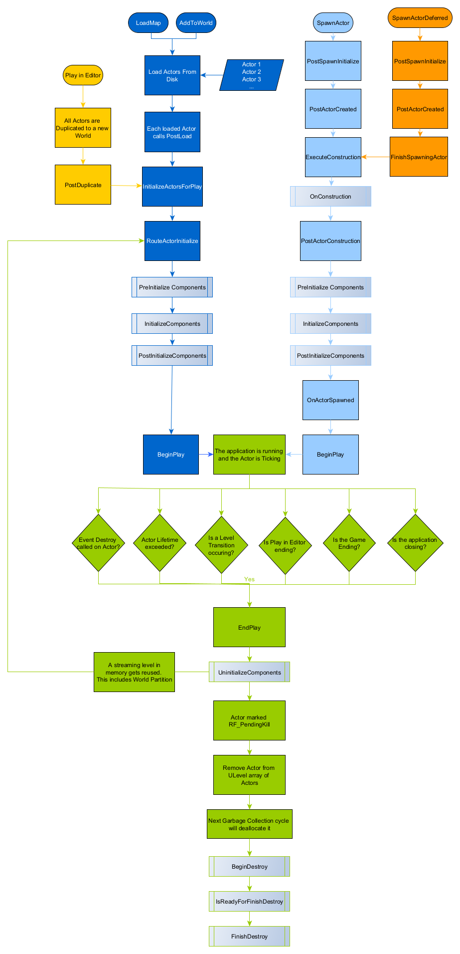 UWorld::SpawnActor : 액터 스폰 시작AActor::PostSpawnInitialize : 액터가 월드에 생성된 이후 호출된다.AActor::PostActorCreated : 액터가 생성된 후 호출되며, 생성자에서 해야 할 초기화 코드는 이 함수에 구현해야 한다.PostLoad와 상호 배타적으로 호출된다.AActor::ExecuteConstruction : 액터의 생성 스크립트(예: 블루프린트의 Construction Script)가 실행된다.AActor::OnConstruction : 액터의 구성 작업이 진행된다.AActor::PostActorConstruction :AActor::PreInitializeComponents : 컴포넌트들의 InitializeComponent가 호출되기 전에 액터 레벨에서 호출된다.UActorComponent::InitializeComponent : 액터에 정의된 각 컴포넌트를 생성하고 초기화하는 헬퍼 이다.AActor::PostInitializeComponents : 모든 컴포넌트가 초기화된 후 호출된다.UWorld::OnActorSpawned : 월드에서 액터가 생성되었음을 알리는 브로드캐스트가 발생한다.AActor::BeginPlay : 게임 플레이가 시작되면 호출된다.요악하면,