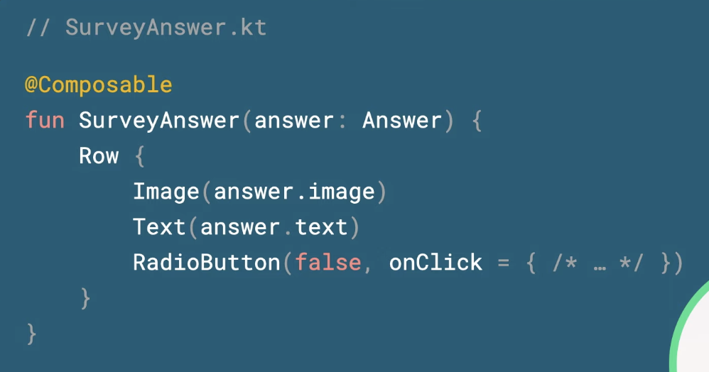 Compose에서 UI 요소는 객체가 아닌 함수이다. 이는 UI 요소에 대한 참조가 불가능하며, 해당 항목을 변경하는 메서드를 호출할 수 없음을 의미한다. 대신, UI 요소는 함수에 전달하는 상태 또는 인수에 의해 완전히 제어된다.