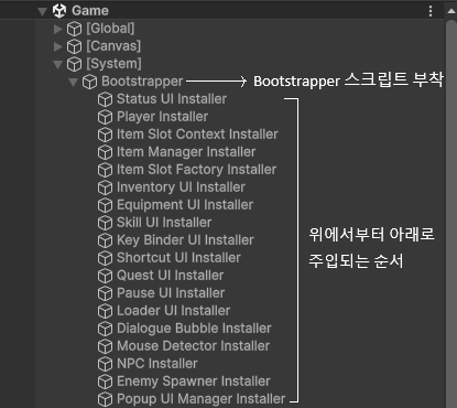 부트스트래퍼가 실질적으로 인스톨러의 순서를 결정하는 것은 유니티의 하이어라키로 결정하며 다음과 같은 구조를 지닌다.
