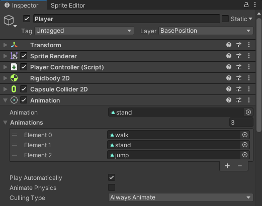 또한 Legacy Animation은 Animation 컴포넌트를 이용하여 게임 오브젝트에 적용된다.