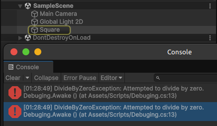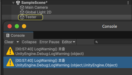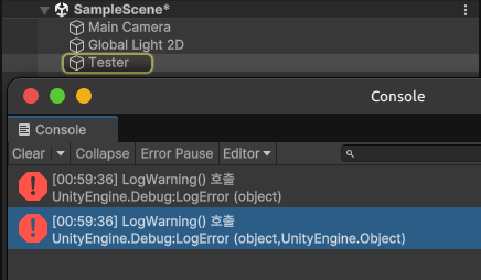 콘솔에서 이 메시지를 클릭하게 되면 하이어라키 창에 있는 오브젝트가 하이라이트된다.