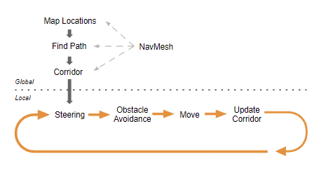 지역 네비게이션은 전역 네비게이션을 통해 생성된 통로를 통해 이동하는 과정을 만드는 작업이다.