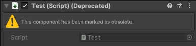 System.Obsolete는 클래스 상단에 선언하며, 인스펙터에서 이 컴포넌트가 사용되지 않는다는 경고문을 노출하고 싶을 때 사용한다.