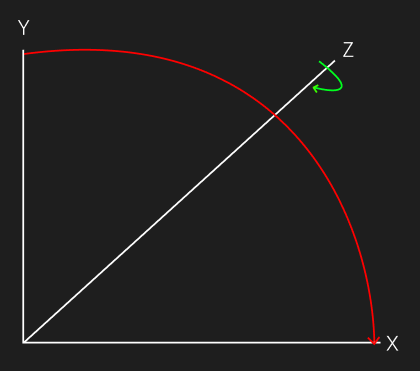Y축을 X축으로 만드는 것과 같기 때문에 Z축으로 90˚ 회전이 발생한다. 회전 쿼터니언을 생성한 것이다.