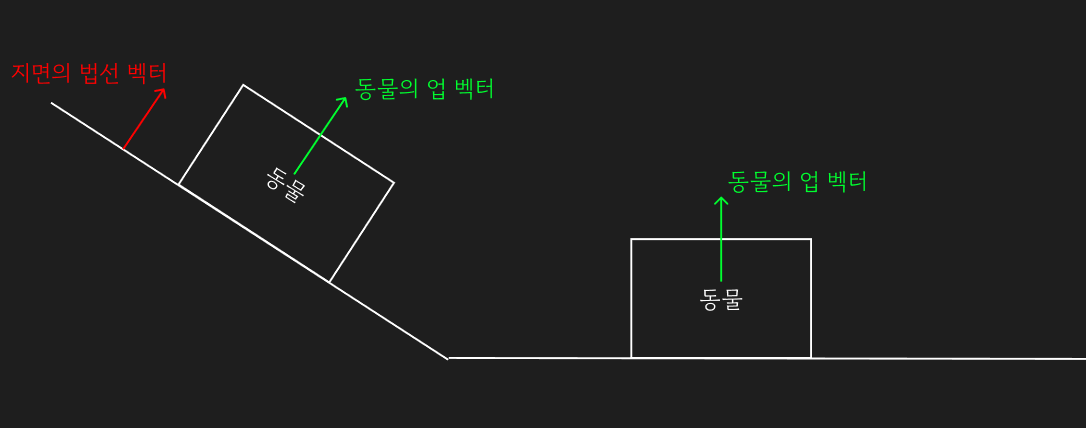 지면의 법선 벡터에 동물의 업 벡터를 일치시키게 되면 동물은 자연스럽게 경사면 위에 있다는 느낌을 받게 되지 않을까 싶었다.