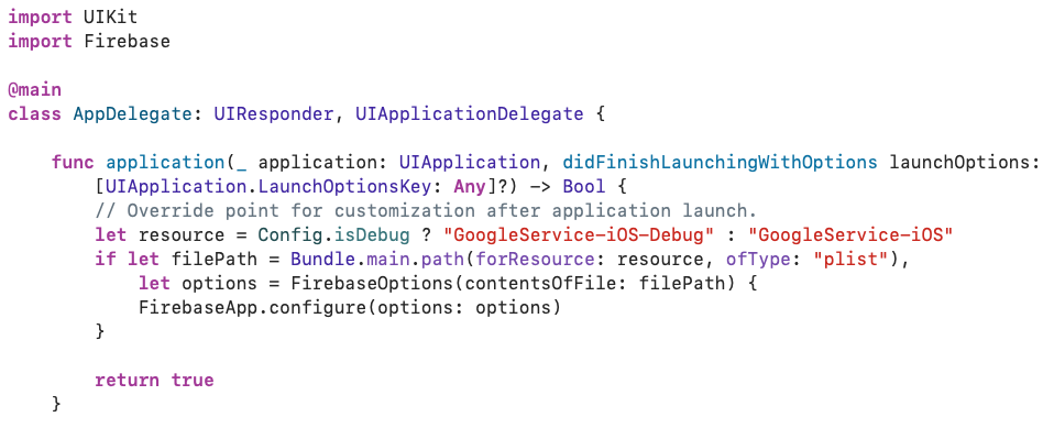 일반적으로 AppDelegate의 application(_:didFinishLaunchingWithOptions:) 메서드에서 구성을 합니다. 다만, 단일 개발 환경에서는 FirebasApp.configure() 한 줄만 적어도 상관 없지만 다중 개발 환경에서는 plist를 개발 환경에 맞게 적용해줘야 합니다.