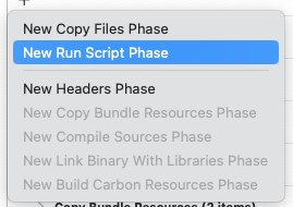 다음으로는 Target(GoodPharm-iOS) -> Build Phase 에서 + > New Run Script Phase(새 실행 스크립트 단계)를 클릭해서 새로운 스크립트를 두 개 만들어 줍니다.