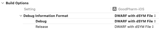 Target(GoodPharm-iOS) -> Build Settings -> Build Options 에서 Debug Information Format(디버그 정보 형식)을 모두 DWARF with dSYM File로 설정합니다.
