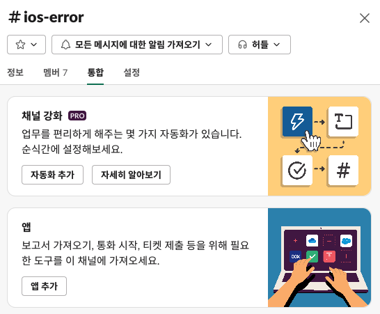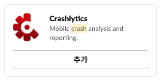 우선, Crashlytics를 추가 할 Slack 채널의 세부정보로 들어갑니다. 통합 탭에서 앱 추가를 선택하고 Crashlytics를 추가 해주면 됩니다.
