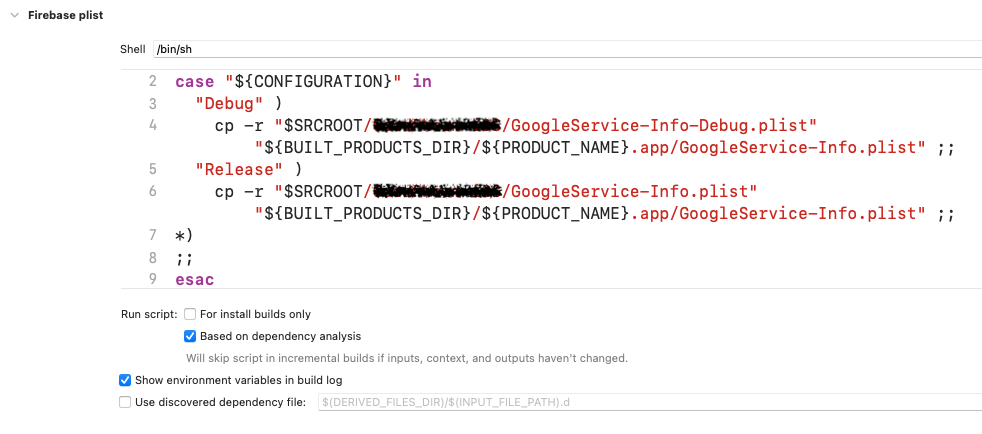 한 개는 개발 환경(CONFIGURATION)에 따라 개발 환경에 맞는 plist를 app에서 실제로 사용하는 plist로 파일을 복사해서 넣어주는 스크립트를 만들어 줍니다.