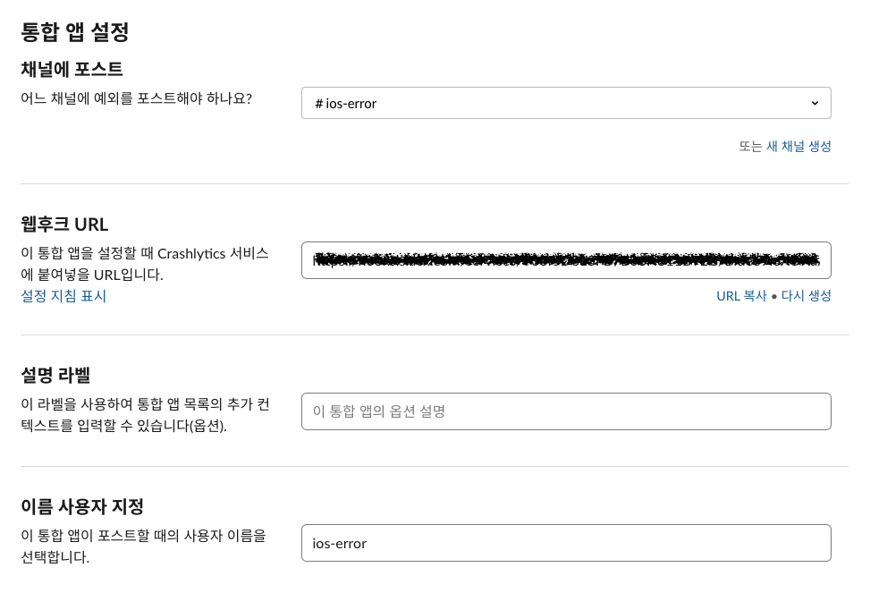 Firebase의 프로젝트 설정에 들어가 Slack을 설치합니다. 이전 단계에서 얻었던 웹후크 URL을 가장 상단의 필드에 입력해줍니다. 그리고 나머지는 채널 이름에 맞게 작성해주시면 연동 작업은 모두 완료되었습니다.