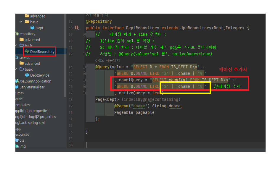 countQuery = "SELECT count(*) FROM TB_DEPT D\n" +