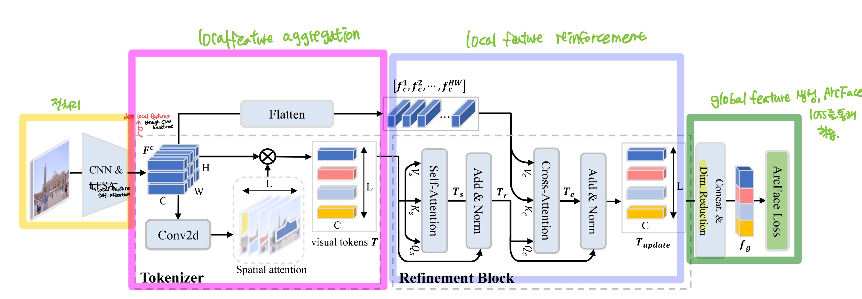 토큰 : 이미지의 특정 시각적 패턴을 나타내는 단위.토큰 모델 : 이미지를 대표하는 특정 시각적 패턴을 추출, 집계하는 방식으로 이미지 검색과 같은 CV 작업에서 사용되는 모델. 토크나이저를 포함한 전체 프레임 워크를 뜻한다.토크나이저 tokenizer : 입력 이미지를 작은 단위(토큰)으로 나누는 과정 또는 도구양자화 : 연속적인 값을 이산 적인 값으로 변환하는 과정 → 모델 효율성을 높이기 위해image corpus : 이미지 코퍼스, 특정 용도로 수집된 대규모 이미지 데이터 셋Transformer model : Self-Attention, Cross-Attention 이 언급되었는데, 이 것은 트랜스포머 모델에서 사용되는 메커니즘이다.self-attention : 자기 주의, 하나의 시퀀스 내 각 요소가 다른 모든 요소들과의 관계를 학습하는 것. ex. 동일한 이미지 내의 중요한 패턴 파악 가능cross-attention : 교차 주의, 두 개의 서로 다른 시퀀스 간의 관계를 파악하는 방법. ex. 다른 이미지와의 관계를 학습하여 특정 패턴이 다른 이미지에도 일관되게 있는 지를 판단할 수 있다.Spatial Attention : 공간 주의 메커니즘, 이미지 데이터의 특정 위치(공간적 위치)에 대한 집중을 높여, 중요한 특징을 더 잘 포착하고 불필요한 정보를 무시하는 기법. 각 위치에서 특징의 중요도를 학습하고, 이를 기반으로 입력 데이터를 강조하거나 억제한다.ArcFace Margin Loss : 얼굴 인식 및 식별에서 사용되는 손실 함수, 기존 softmax 손실을 확장하여 클래스 간 분리를 강화하고, 동일 클래스 내에서의 특징 벡터의 compact 함을 증가시키는 역할을 한다. 여기서 유클리디언 거리가 아닌 각도를 기준으로 분류를 한다.