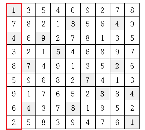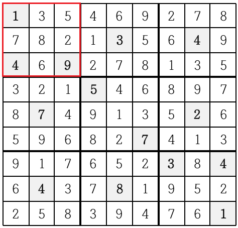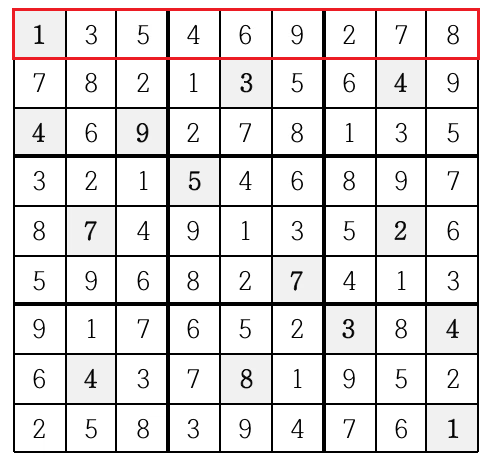 위의 예의 경우, 첫째 줄에는 1을 제외한 나머지 2부터 9까지의 숫자들이 이미 나타나 있으므로 첫째 줄 빈칸에는 1이 들어가야 한다.