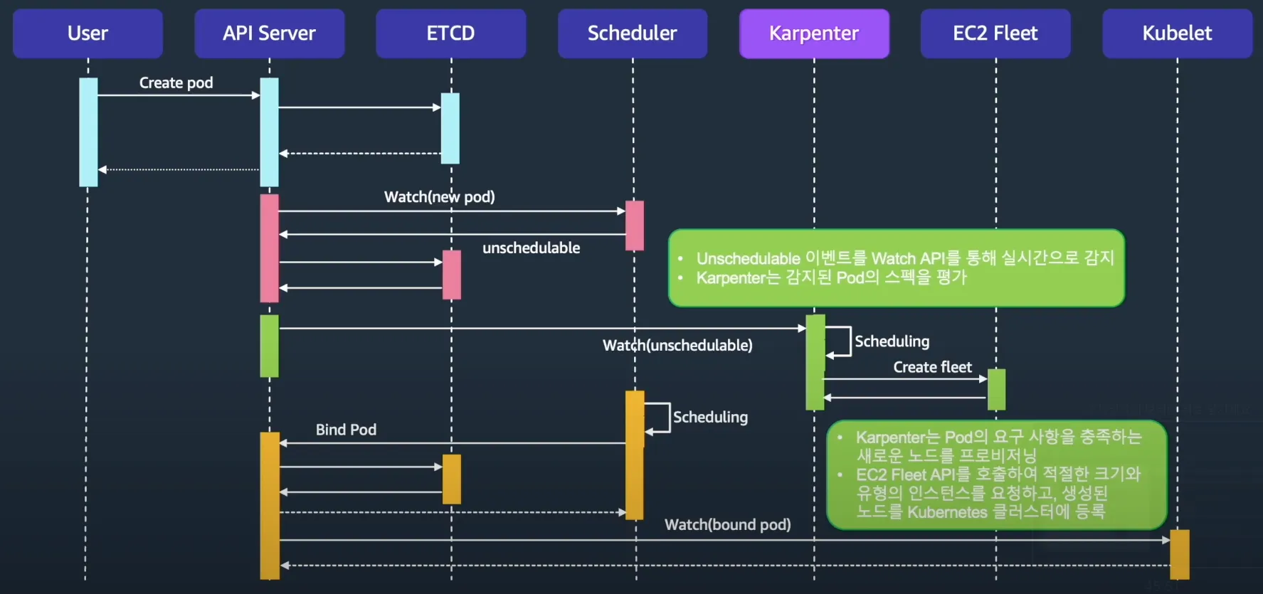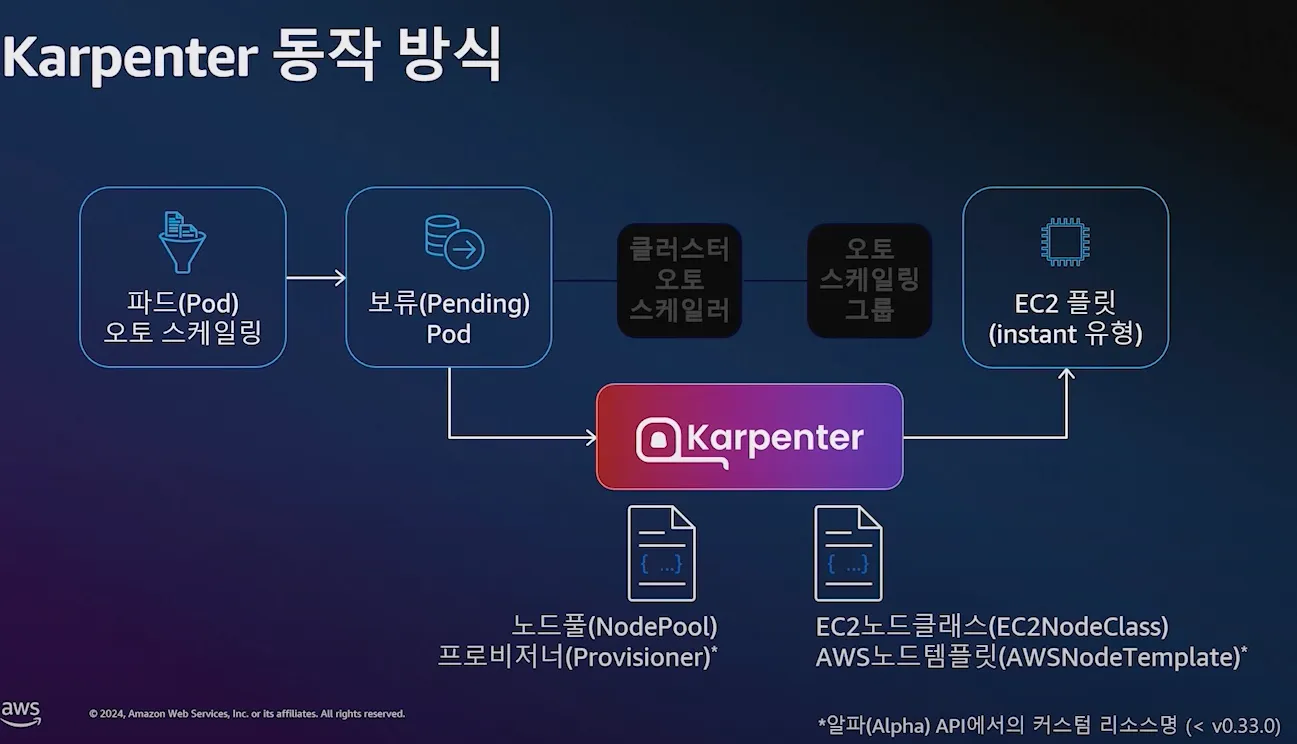 - 파드(Pod) 오토 스케일링 → 보류(Pending) Pod → Karpenter → EC2 플릿(instant 유형)