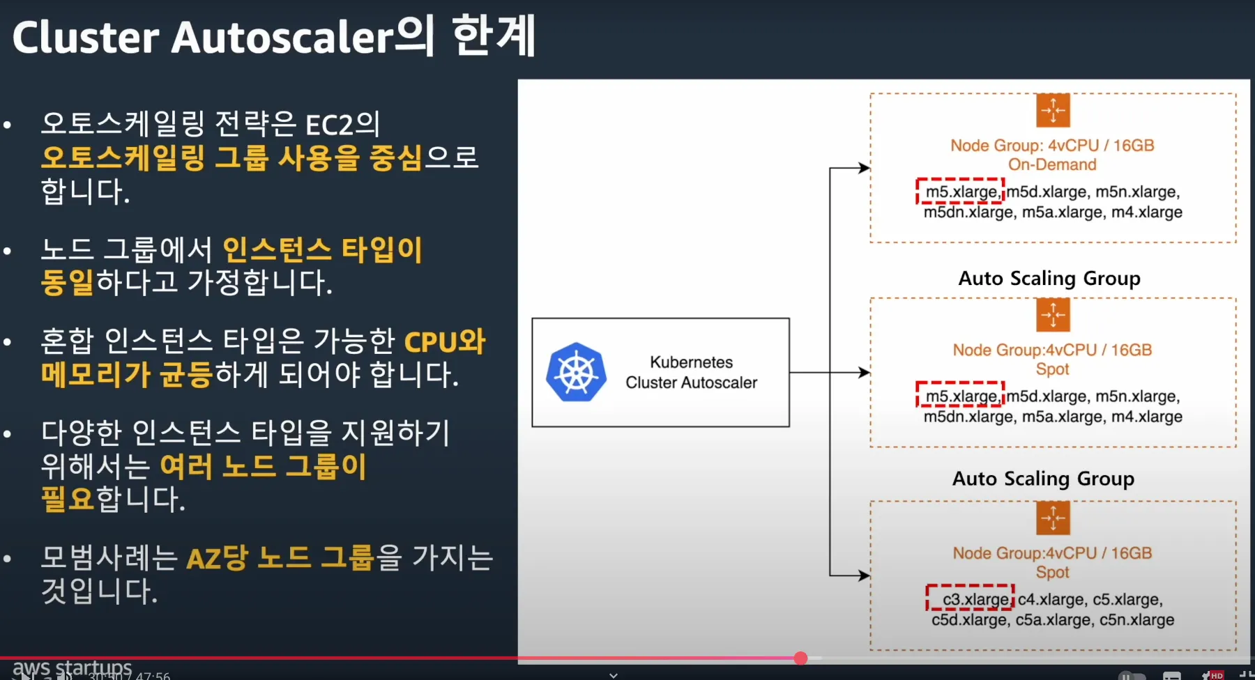 - 노드 그룹 내에서 인스턴스 타입이 동일하다고 가정하기 때문에 서로 다른 인스턴스 타입을 사용하려면 별도의 노드 그룹을 생성해야 합니다. 다양한 인스턴스 타입을 지원하려면 여러 개의 노드 그룹을 구성해야 합니다.