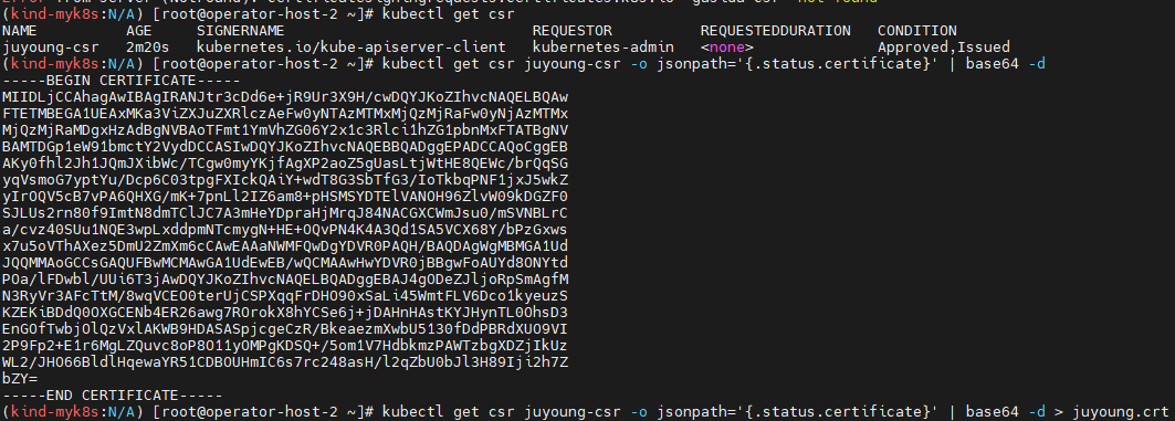 CSR이 승인된 후, 아래 명령을 사용하여 발급된 인증서를 확인할 수 있습니다. 이 인증서를 kubeconfig 파일에 추가하여 사용자가 인증된 접근을 할 수 있도록 설정해야 합니다.