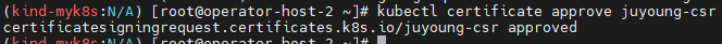 CSR을 승인하면 Kubernetes CA가 해당 요청을 검토하고 서명하여 유효한 클라이언트 인증서를 발급하게 됩니다. 이후, 사용자는 발급된 인증서를 이용하여 클러스터 내에서 인증된 사용자로 동작할 수 있습니다.